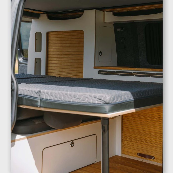 Wahlweise kann das Schlafsystem MobyVan verbaut werden oder jede andere Schlafsitzbank. Wir verbauen hier gerne die 2er Kombisitzbank mit unserem eigenen, leicht zu klappenden Schlafsystem.