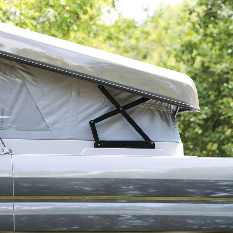 Das Dach stellt vorne auf und nutzt extra hohe Aufstellscheren für viel Bewegungsfreiheit im Fahrzeug. Geschlossen wird es über ein einfaches, zuverlässiges Southco-Verschlusssystem – schnell zu bedienen und sicher während der Fahrt.