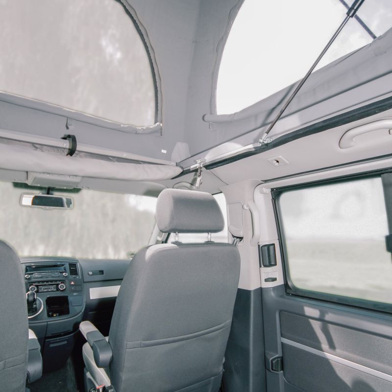Das Dach stellt vorne hoch auf und bietet dir damit eine sehr großzügige Stehhöhe im Fahrzeug. Geschlossen wird es mit stabilen Southco-Verschlüssen und integrierten Sicherheitsgurten – schnell, zuverlässig und absolut tourentauglich.