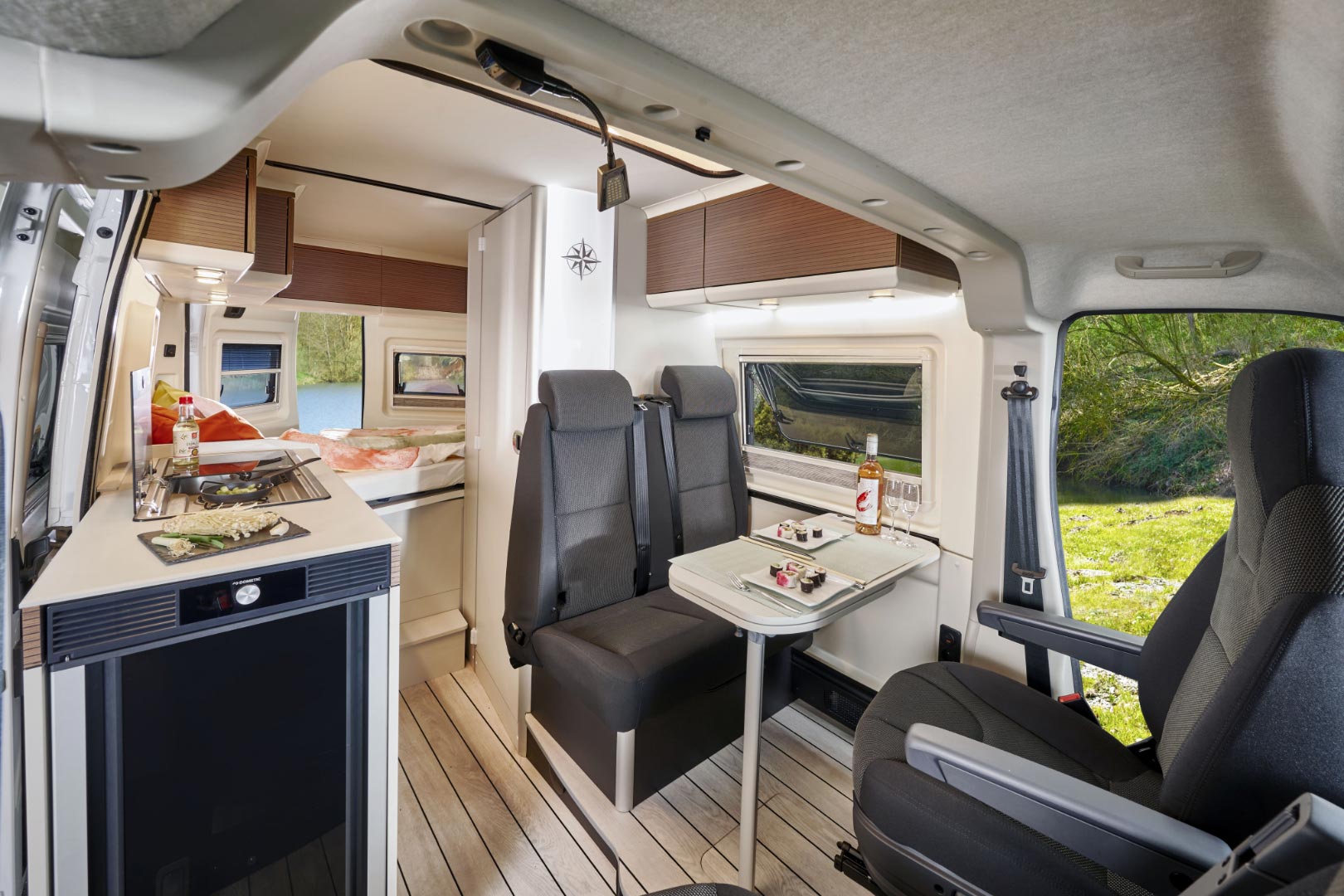 Im Innenraum überzeugt der Columbus 540 D mit clever durchdachtem Raumkonzept und gemütlicher Atmosphäre. Das großzügige Querbett im Heck bietet dank hochwertiger Unterfederung einen Schlafkomfort, wie man ihn sonst nur von zu Hause kennt. Tagsüber verwandelt sich der Wohnraum mit seiner variablen Sitzbank und der funktionalen Küche in einen gemütlichen Treffpunkt – perfekt für Frühstück mit Aussicht oder den Sundowner nach einem erlebnisreichen Tag.
