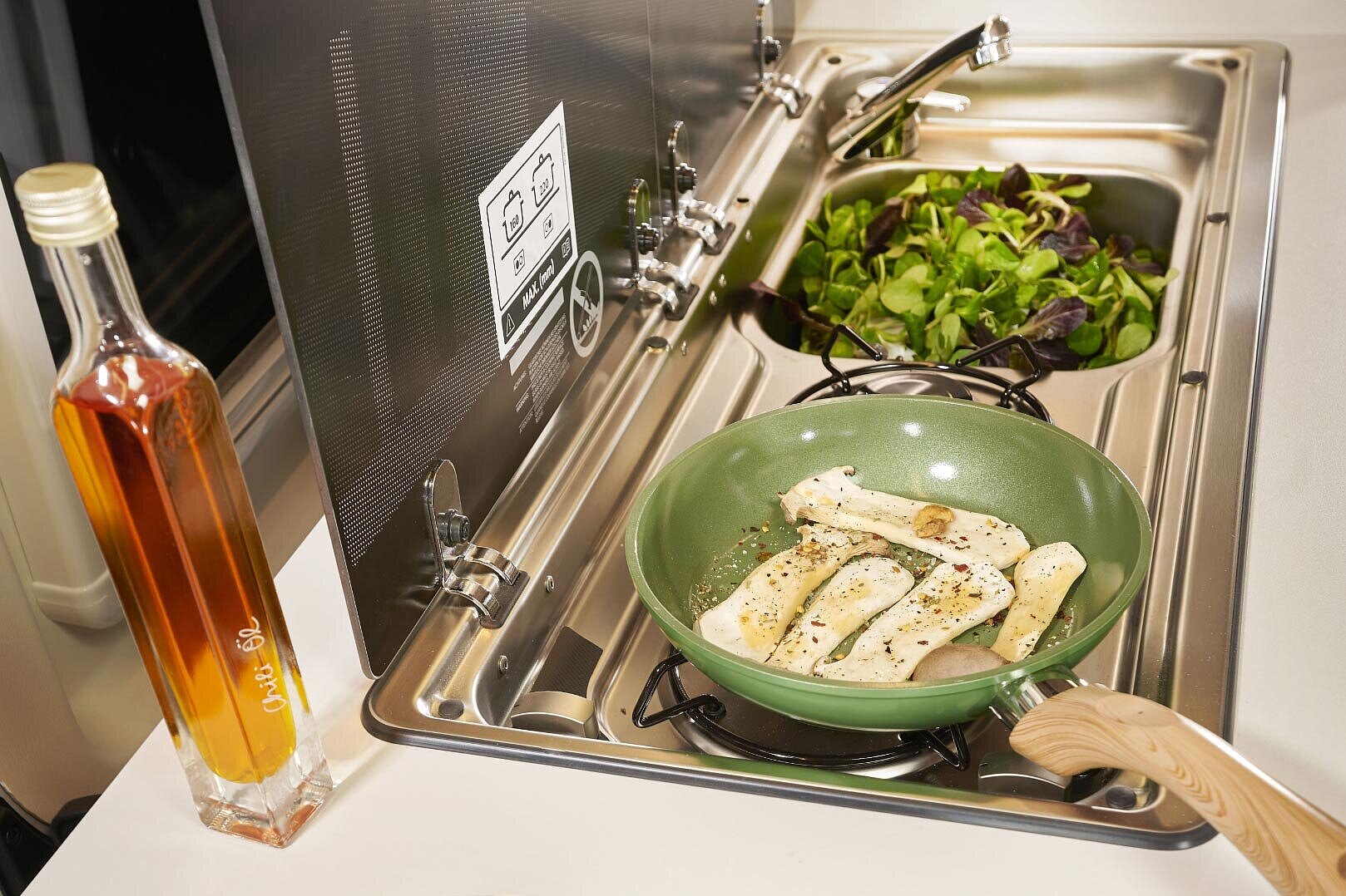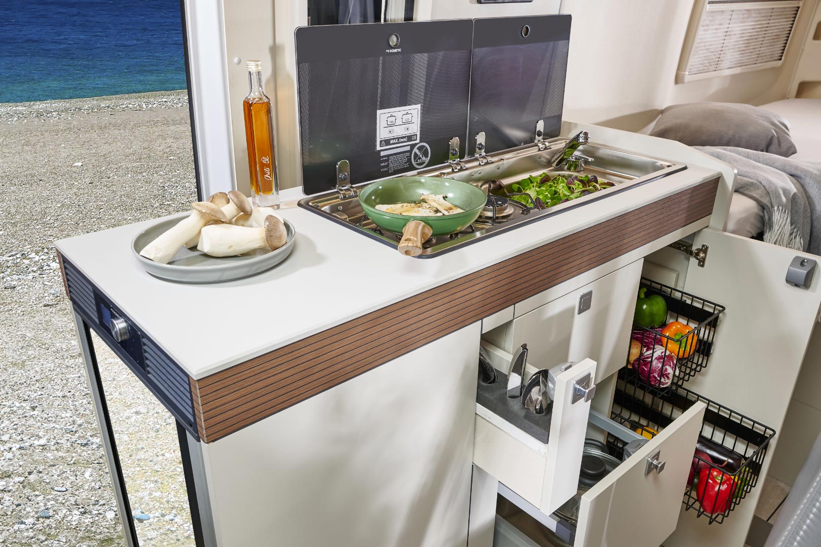 Der gemütliche Wohnbereich lädt zum Wohlfühlen ein – morgens beim ersten Kaffee mit Blick in die Natur oder abends beim gemütlichen Essen zu zweit. Die kompakte Küche mit Arbeitsfläche, Spüle und Kochfeld auf einer Ebene ist überraschend großzügig gestaltet und durchdacht bis ins Detail. Der 90-Liter-Dometic-Kühlschrank mit beidseitiger Türöffnung sorgt für schnellen Zugriff – egal, ob du drinnen kochst oder draußen genießt.
